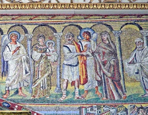 Древнейший образ Сретения можно найти в одной из мозаик триумфальной арки в церкви Санта Мария Маджоре в Риме. Мозаика была создана в первой половине V века. На ней мы видим, как Богоматерь шествует с Младенцем на руках навстречу святому Симеону — в сопровождении ангелов.