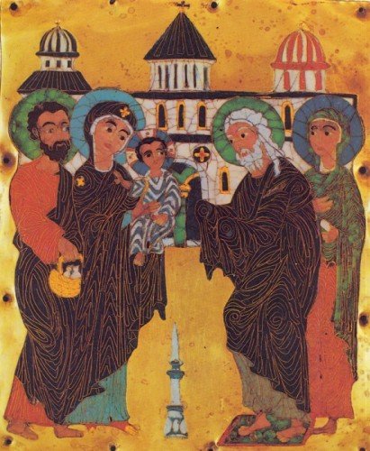 Необычный вариант иконографии Сретения есть в средневековом грузинском искусстве. На этих иконах нет изображения алтаря, вместо него — горящая свеча, символ жертвы Богу.