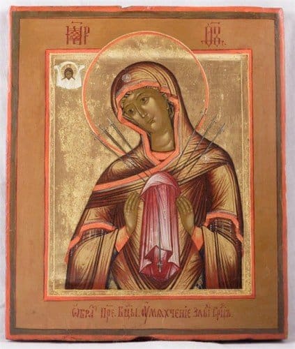 Кстати, этот образ очень похож на икону Божией Матери «Семистрельную». Но есть одно отличие. Стрелы, пронзающие сердце Богородицы, расположены на иконе «Умягчение злых сердец» по три справа и слева, одна снизу. У «Семистрельной» иконы — четыре стрелы с одной стороны и три с другой.