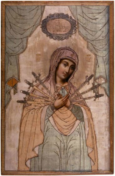 Споры в народе — это преследования, которые были уготованы Спасителю. Открытие помышлений — Суд Божий. Что за оружие пронзит сердце Богородицы? Это было пророчеством о Распятии, которое ждало ее Сына. Ведь гвозди и копье, от которых принял смерть Спаситель, прошли нестерпимой болью через ее материнское сердце. Есть икона Богородицы — яркая иллюстрация этого пророчества. Она называется «Умягчение злых сердец». Иконописцы изображают Богоматерь стоящей на облаке с семью воткнутыми в сердце мечами.