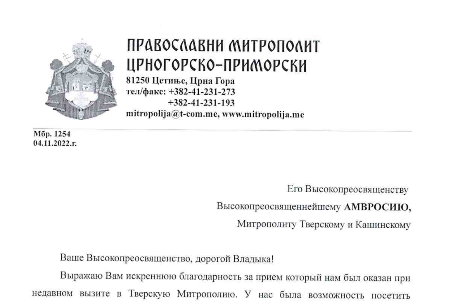 В адрес митрополита Тверского и Кашинского Амвросия поступило благодарственное письмо от митрополита Черногорско-Приморского Иоанникия за теплый прием, который был оказан Его Высокопреосвященству во время визита в Тверскую епархию в октябре этого года: