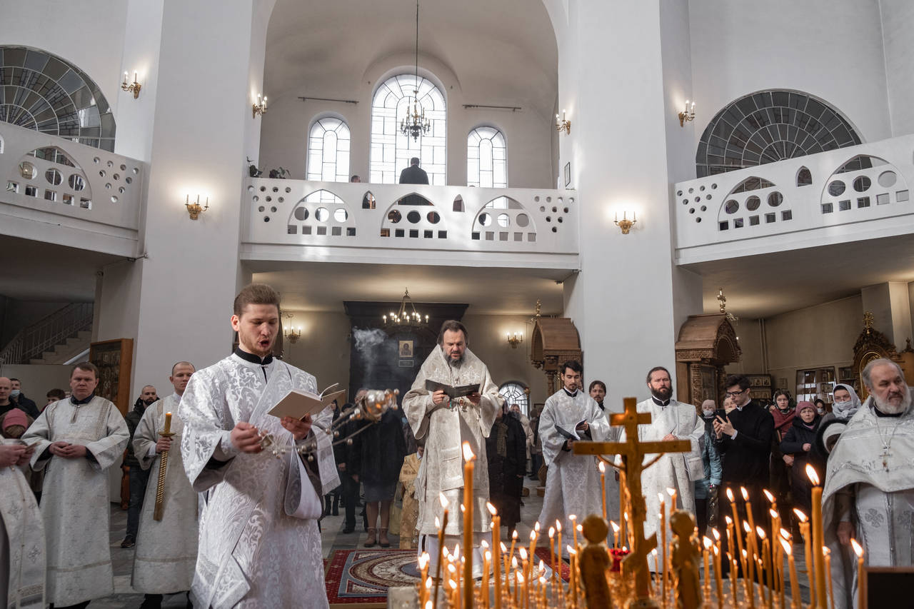 После пения запричастного стиха священник Сергий Будков огласил Обращение Святейшего Патриарха Кирилла к архипастырям, пастырям, монашествующим и всем верным чадам Русской Православной Церкви от 24 февраля.