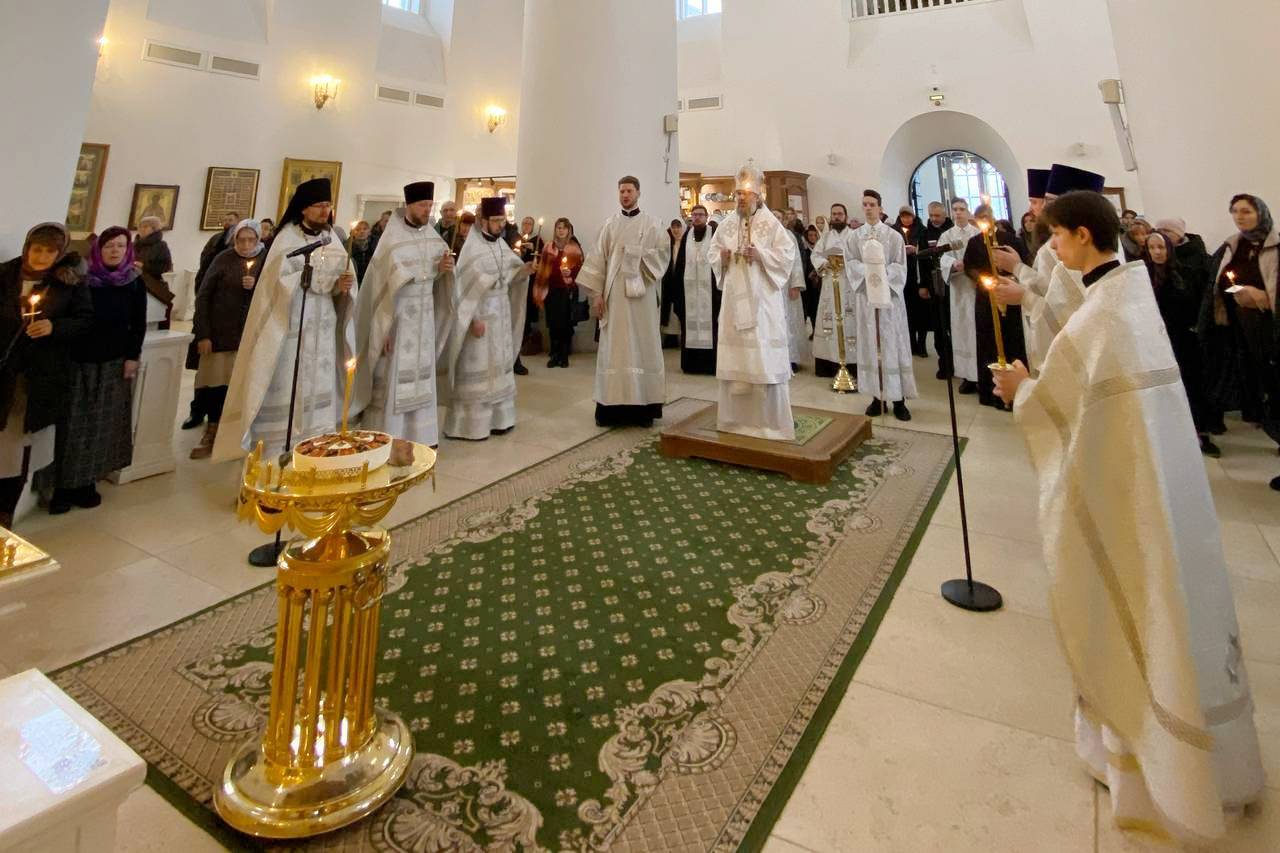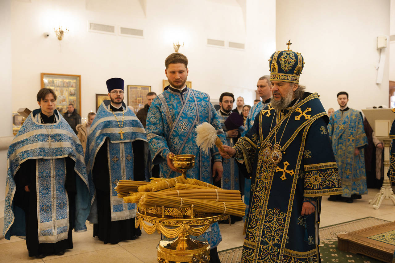 Во время чтения канона на утрене, архипастырь помазал молящихся освященным елеем.