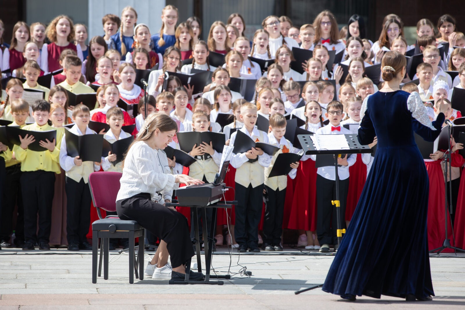 Концерт Всероссийского детского Победного хора прошел возле главного входа в Музей Победы. Свое мастерство показали свыше 700 детей из 30 регионов России и Республики Беларусь.