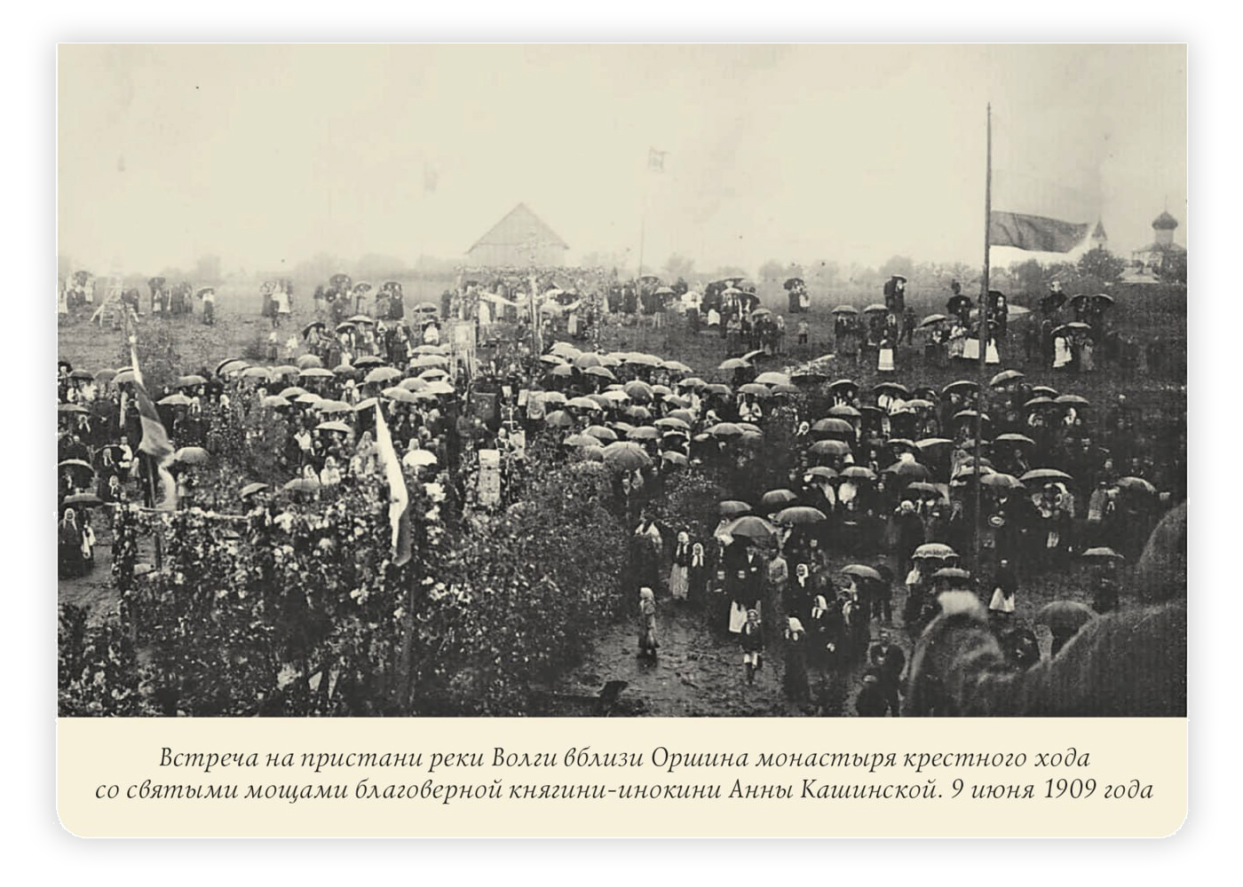 При отплытии собравшихся на берегу богомольцев с борта парохода напутствовал благословением Преосвященный епископ Старицкий Алипий, священники осеняли святыми иконами благоверных князя Михаила Тверского и княгини Анны Кашинской, а народ набожно крестился.