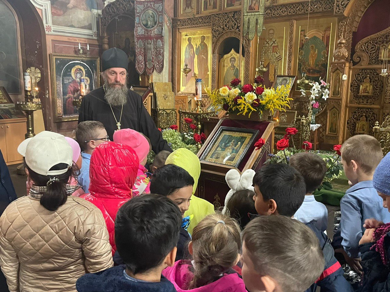 Настоятель прихода протоиерей Пётр Дубяго в своей проповеди рассказал историю праздника. По окончании службы он провёл беседу для детей на тему праздника. На аналое рассмотрели иконографию образа, поговорили о детстве Девы Марии, прочитали песнопения праздника, вспомнили и историю праздника Успения Пресвятой Богородицы, которому посвящен главный придел одного из храмов.