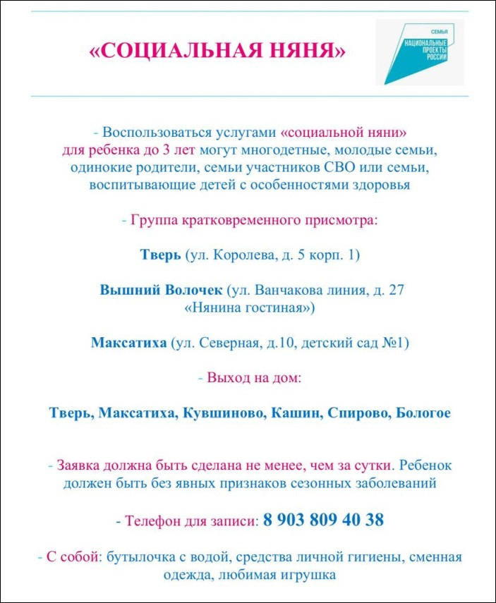 В рамках реализации национального проекта «Семья» с 1 января 2025 года в Тверской области начали действовать новые меры поддержки для семей, в том числе в июле 2025 года в Тверской области стартовала мера поддержки услуги «социальной няни» для детей до 3 лет из определенных категорий семей.