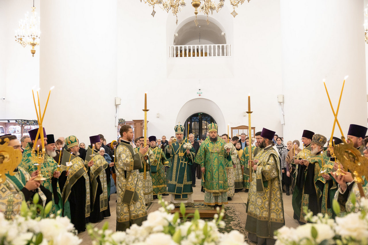 Большая радость физически находиться и молиться в этом возрождающемся соборе, в месте исполнения правды Божьей, в месте исправления ошибок предшествующих поколений и молиться, дорогой владыка, вместе с Вами, потому что многие Ваши труды, как наставника для нас, молодых архиереев, это пример постоянства, методичности, должной строгости, и при этом любви к священнослужителям и пастырям. Благодарю Вас сердечно за приглашение, за благословение сегодня быть здесь у мощей преподобноисповедника Сергия, который являл дневную гармонию в стремлении к заботе об Отечестве земном и непрестанное несомненное первенство в стремлении к Отечеству Небесному.
