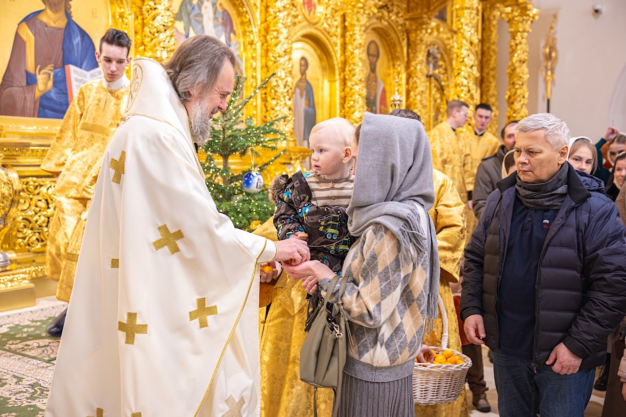 В конце Литургии митрополит Амвросий поздравил духовенство, горожан, гостей и всех молящихся на богослужении с наступившим новым, 2026 годом и каждого благословил на грядущий год. Архиерей угостил мандарином тех, кто пришел молитвенно встретить Новый 2026 год.