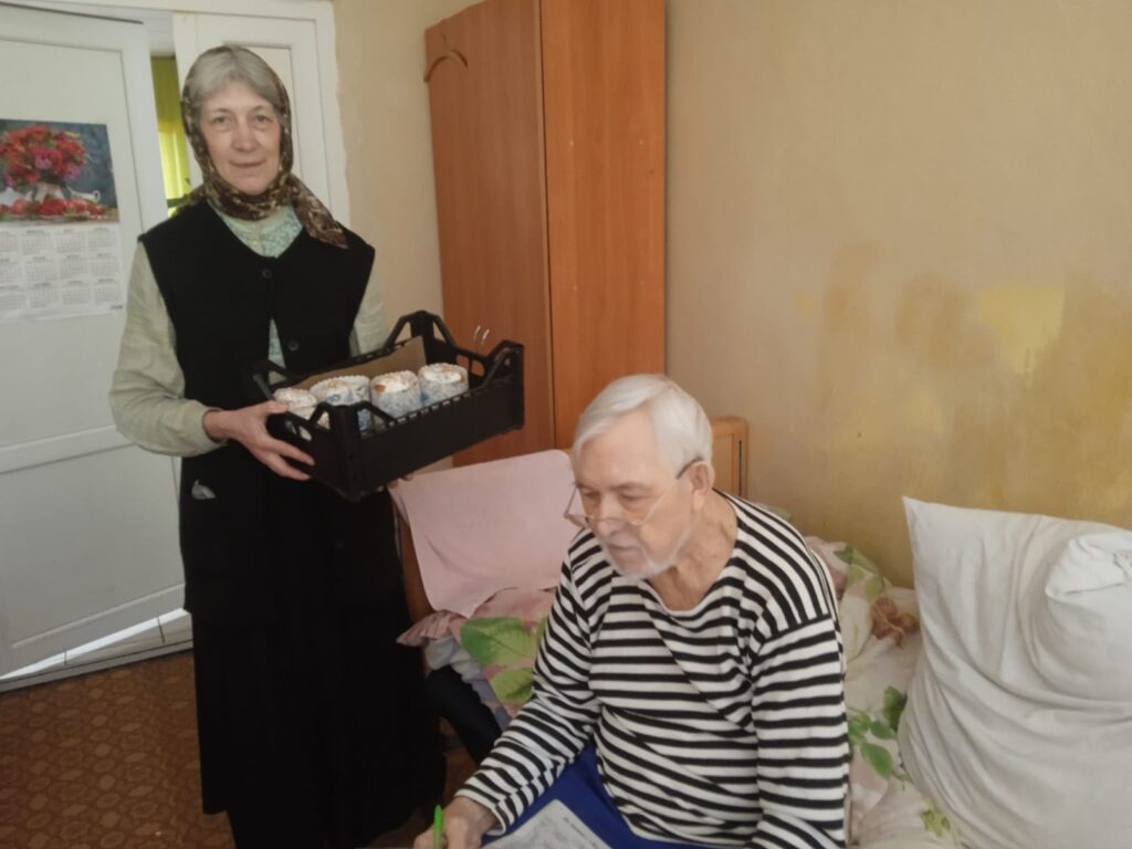 Специально к празднику Святой Пасхи, чтобы доставить радость пожилым одиноким людям, приход храма совместно с Епархиальным отделом социального служения заказали в пекарне 170 куличей. Социальный работник храма и сотрудники социального отдела обошли все палаты, поздравили проживающих престарелых людей и инвалидов с наступающим праздником Пасхи и подарили каждому кулич.