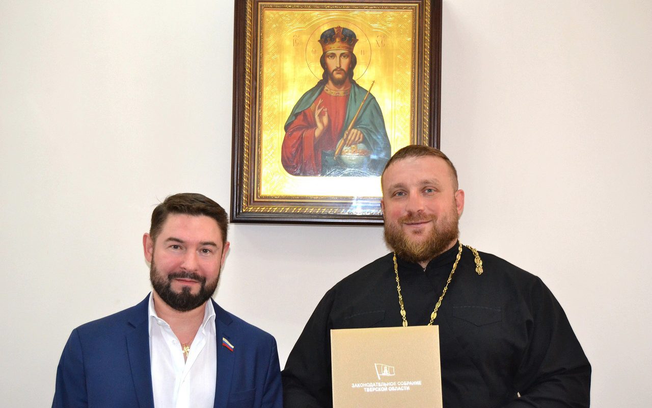 Депутат Законодательного Собрания Тверской области Павел Королёв вручил председателю Отдела по делам молодежи, физической культуры и спорта Тверской епархии, настоятелю храма в честь святого благоверного князя Александра Невского на Привокзальной площади иерею Кириллу Алексееву диплом с Благодарностью Законодательного Собрания Тверской области за большой вклад в духовно-нравственное и патриотическое воспитание молодежи.