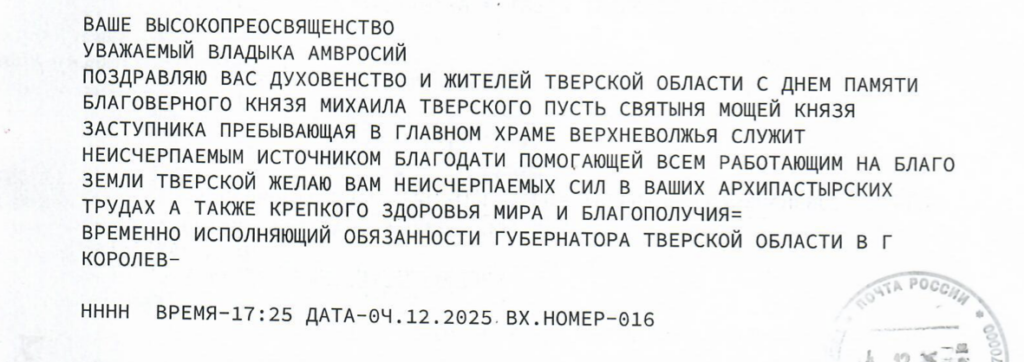 Поздравление врио губернатора Тверской области с днем памяти святого князя Михаила Тверского