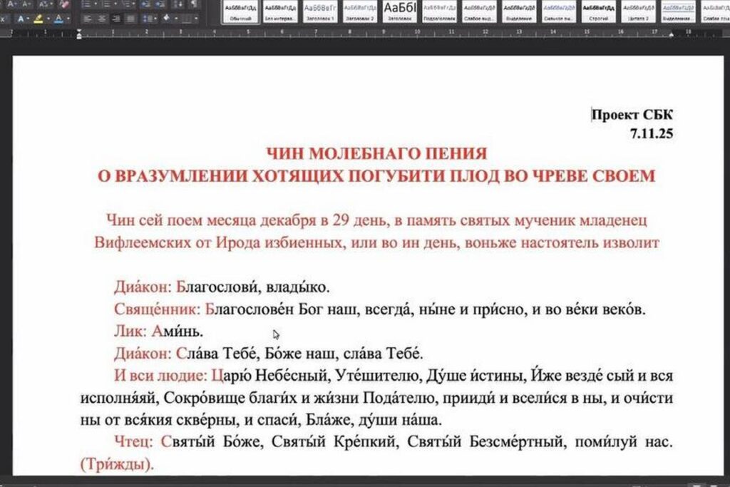 Кроме того, на заседании был рассмотрен, одобрен и отправлен на утверждение чин молебного пения о вразумлении хотящих погубити плод во чреве своем, составленный Комиссией по поручению Священного Синода (журнал № 105 от 30 октября 2025 г.).