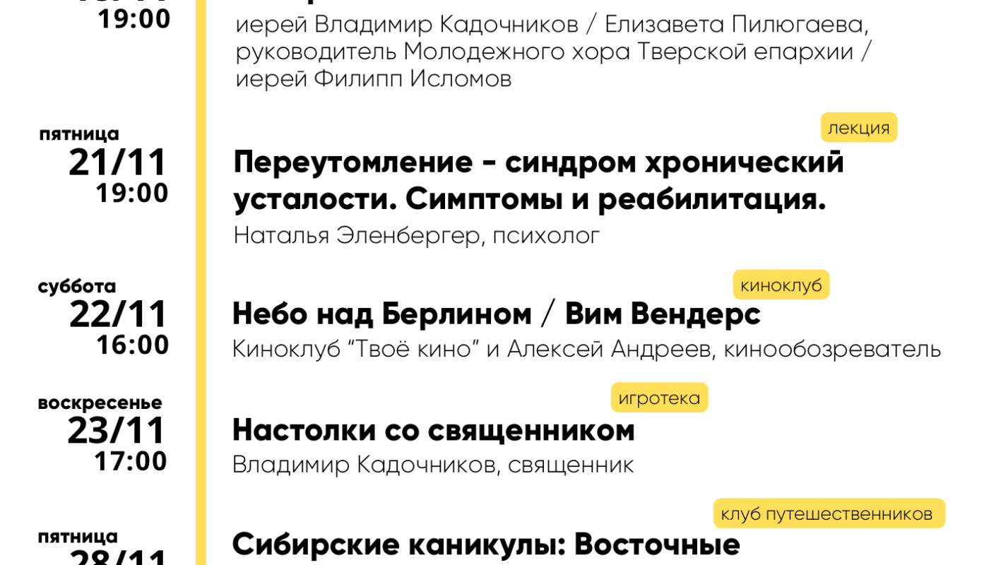 Во время весенних каникул в храме Воскресения Христова (Трех исповедников) г. Твери для приходских детей-школьников в течение недели организовывались бесплатные культурные и просветительские мероприятия и мастер-классы (посещение кинотеатра «Звезда», было закуплено 13 билетов, мастер-классы по мыловарению и созданию восковой свечи – материалы закупались приходом; квест и чаепитие в заключительный день).