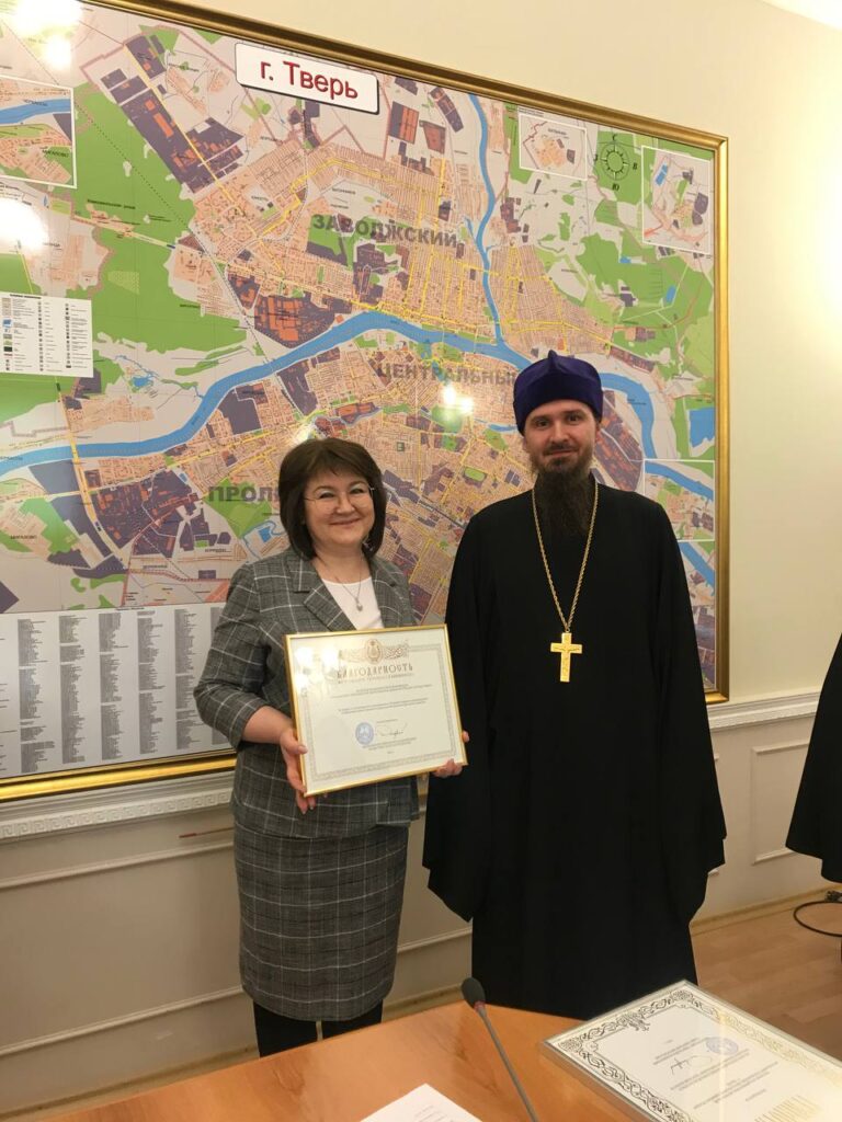 В конце встречи начальнику Управления образования администрации г. Твери Н.В. Жуковской была вручена Архиерейская благословенная грамота «за популяризацию православной культуры в образовательных организациях Тверской области».