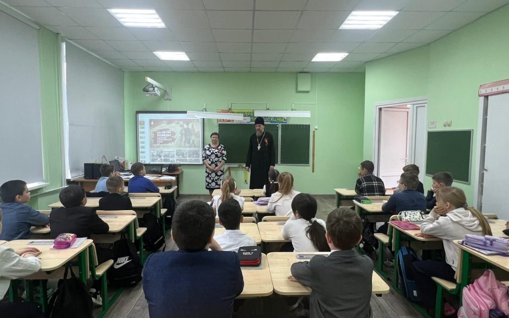 Протоиерей Олег Шерышев, настоятель храма Сорока Севастийских мучеников в Конаково, посетил школу, рассказал ученикам первых и вторых классов подвигах детей во время войны, значении писем-треугольников и роли животных на фронте.