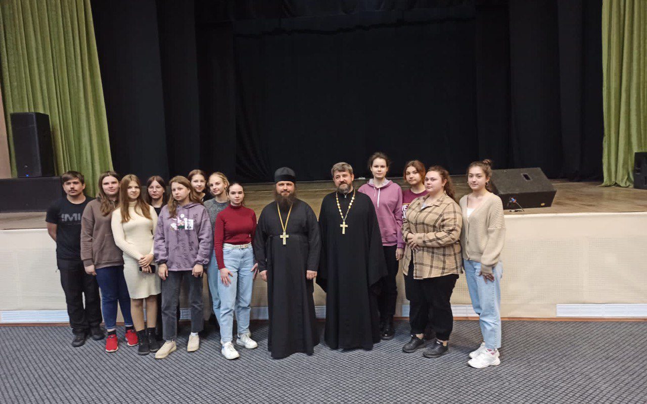 В районном Доме культуры с учащимися и студентами г. Старицы встретились благочинный Старицкого церковного округа, настоятель Ильинской церкви протоиерей Владимир Марценюк и наместник старицкого Свято-Успенского мужского монастыря игумен Дамаскин (Леонов).