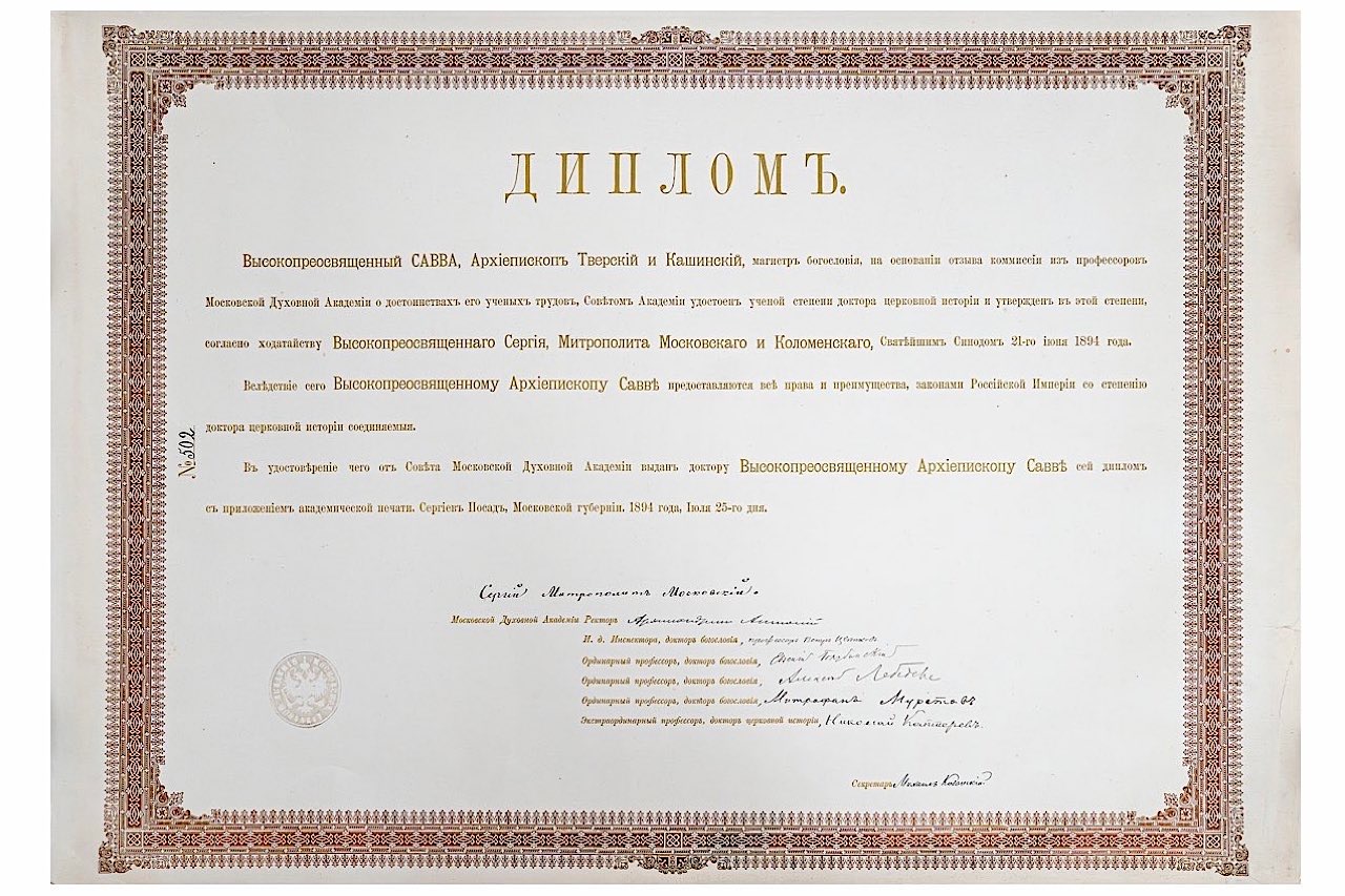 «Высокопреосвященный Савва, Архиепископ Тверской и Кашинский, магистр богословия, на основании отзыва комиссии из профессоров Московской Духовной Академии о достоинствах его ученых трудов, Советом Академии удостоен ученой степени доктора церковной истории и утвержден в этой степени, согласно ходатайству Высокопреосвященного Сергия, Митрополита Московского и Коломенского, Святейшим Синодом 21-го июня 1894 года.