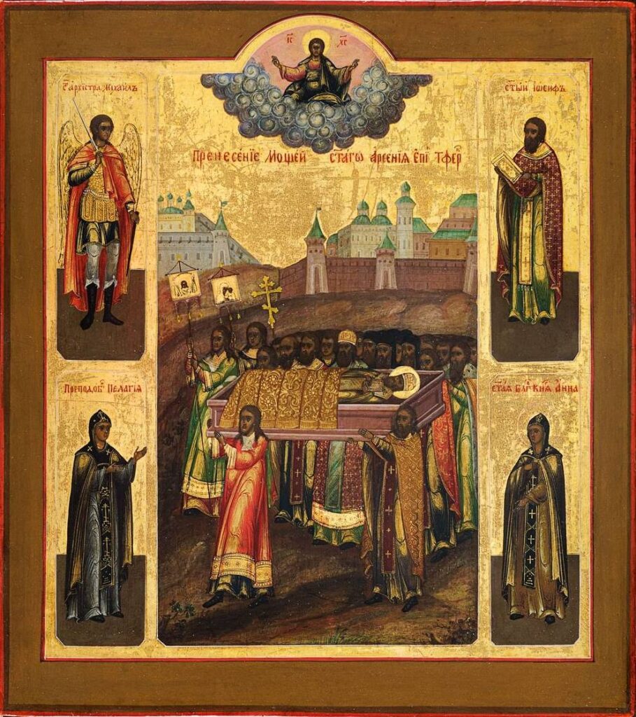 Сегодня, 14 марта, накануне Недели Крестопоклонной, на всенощном бдении состоялось принесение уникальной иконы святителя Арсения Тверского второй половины XIX века в Спасо-Преображенский кафедральный собор г. Твери.