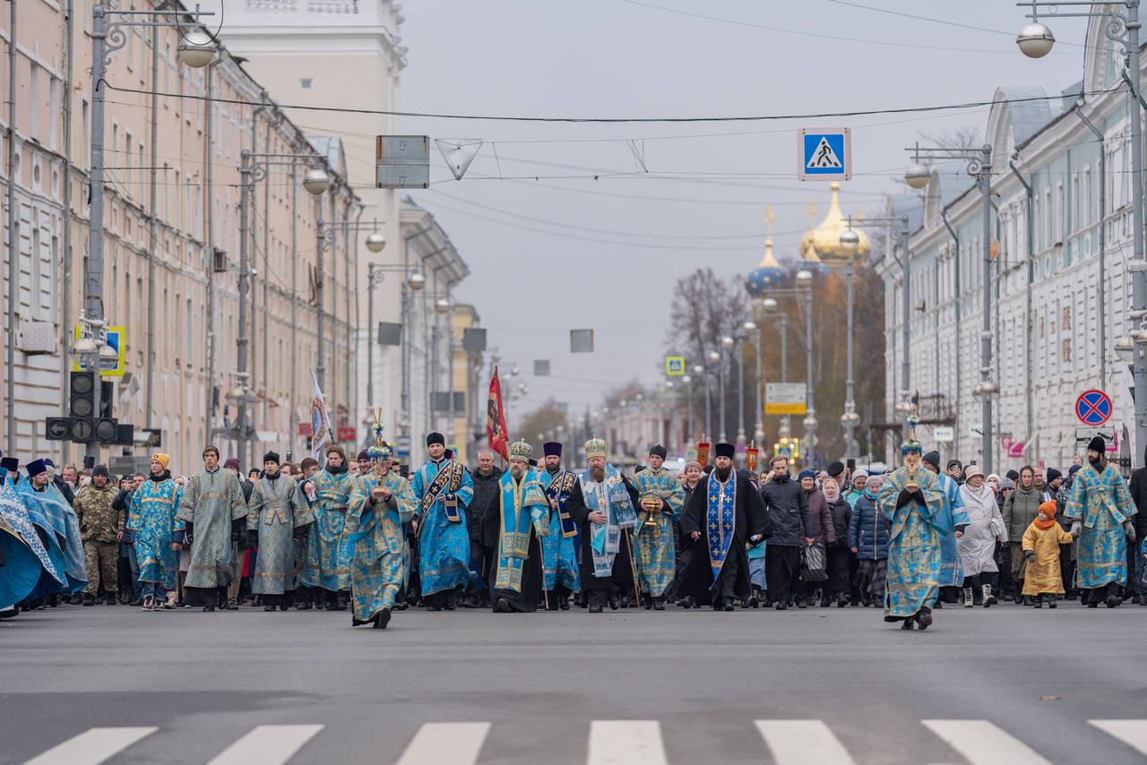 Участники крестного хода под колокольный звон и молитвенные песнопения прошли по улицам города от Воскресенского кафедрального собора до площади благоверного князя Михаила Тверского. Во время шествия народ соборно молился Господу и Богородице о нашем Отечестве и народе, о мире и избавлении от бед и несчастий.