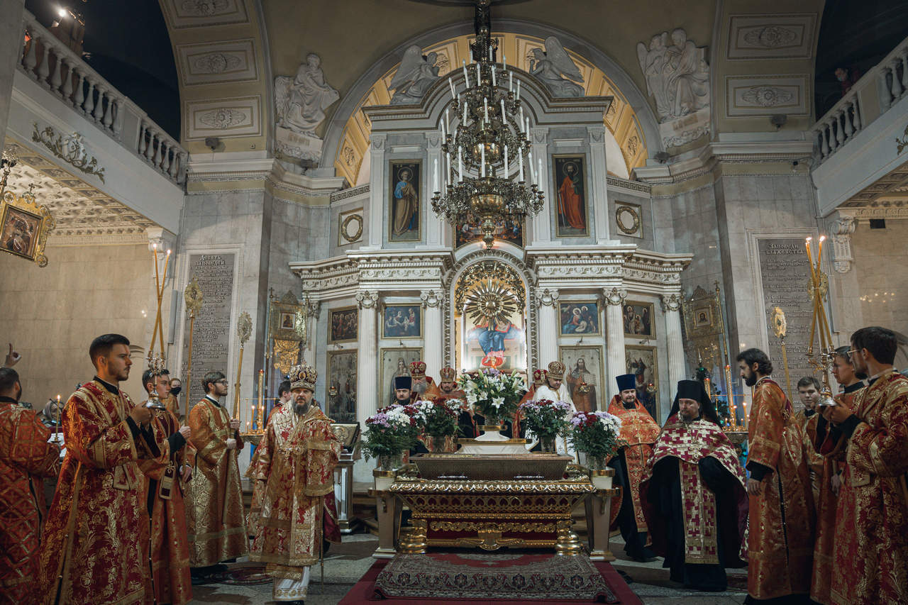 Полиелей совершался у раки с мощами святого, украшенной ко дню памяти священномученика Фаддея. По обычаю, раку установили в центре храма на возвышении, чтобы молящиеся могли приложиться к честным мощам святого.