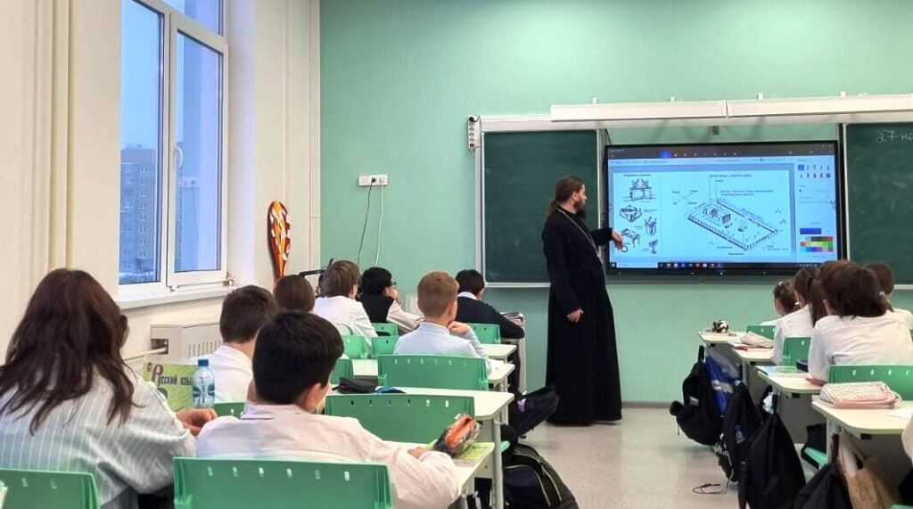 Урок провел клирик Воскресенского собора г. Твери священник Максим Желябовский. Он рассказал о многовековых традициях и архитектурных особенностях православных церквей. Ребята получили возможность узнать о символическом значении различных элементов внутреннего убранства. Были освещены основные этапы строительства и развития храмовой культуры.