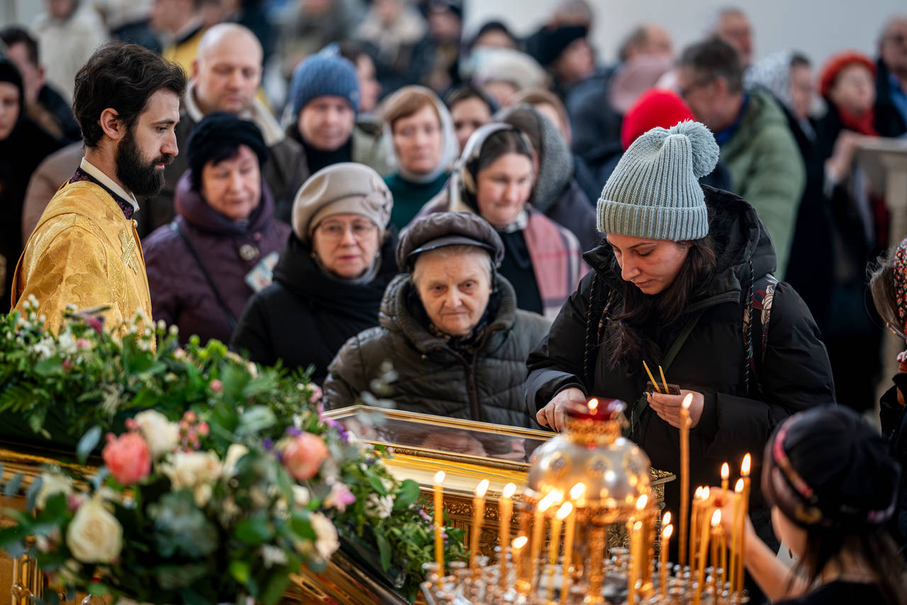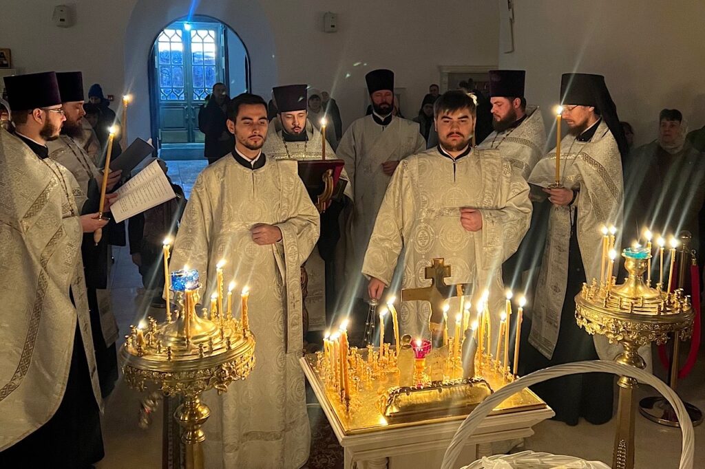 За богослужением молились прихожане и приходящие поклониться мощам святителя Николая Чудотворца, которые в эти дни пребывают в главном соборе Твери.
