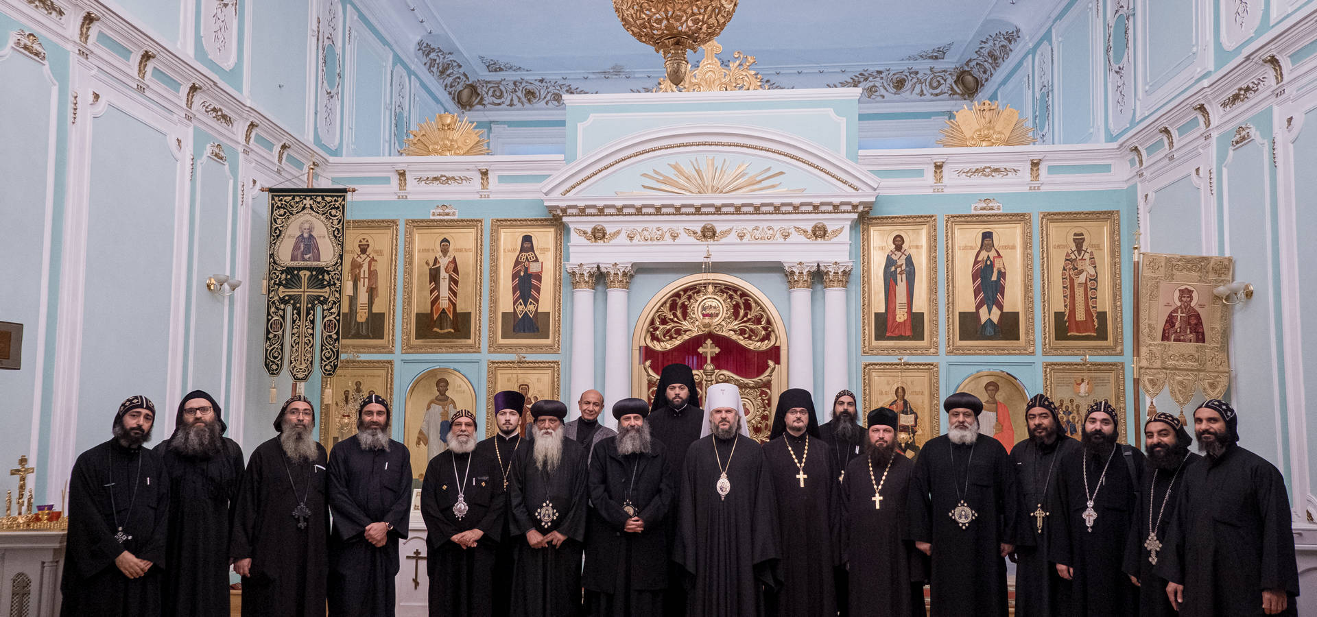 В составе прибывшей делегации — настоятель Эль-Мухарракской обители во имя Пресвятой Девы Марии (провинция Асьют) епископ Вукол, глава делегации; настоятель монастыря во имя святых Фомы и Виктора в Хадабе (провинция Южный Синай) епископ Саверий; настоятель монастыря Пресвятой Девы Марии в Ахмиме (провинция Сохаг) епископ Матфей; наместник монастыря преподобного Паисия Великого в Нитрийской пустыне епископ Агафий; первый Патриарший викарий в Каире епископ Михаил; Патриарший секретарь, насельник монастыря преподобного Паисия Великого в Нитрийской пустыне иеромонах Кирилл Анба Бишой; насельник Эль-Мухарракской обители во имя Пресвятой Девы Марии (провинция Асьют) иеромонах Тавадрос Эль Мохарраки; насельник монастыря во имя святых Фомы и Виктора в Хадабе (провинция Южный Синай) монах Макарий эль-Томаси; насельник монастыря Пресвятой Девы Марии в Ахмиме (провинция Сохаг) монах Юссеф эль-Ахмими; насельники монастыря преподобного Макария Великого в Нитрийской пустыне монах Пётр эль-Макари, монах Зевс эль-Макари, монах Меркурий эль-Макари и монах Марк эль-Макари; специальный представитель Коптской Патриархии доктор Антон Милад.